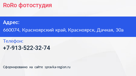RoRo, фотостудия по адресу 660074, Красноярский край, Красноярск, Дачная, 30а в дальнейшем Организация, размещена в следующих категориях: