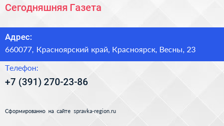 Сегодняшняя Газета по адресу 660077, Красноярский край, Красноярск, Весны, 23 в дальнейшем Организация, размещена в следующих категориях:
