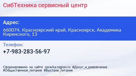 СибТехника, сервисный центр по адресу 660074, Красноярский край, Красноярск, Академика Киренского, 13 в дальнейшем Организация, размещена в следующих категориях: