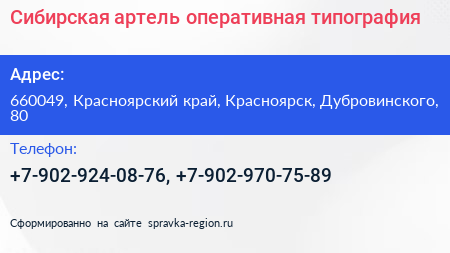Сибирская артель, оперативная типография по адресу 660049, Красноярский край, Красноярск, Дубровинского, 80 в дальнейшем Организация, размещена в следующих категориях: