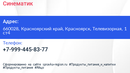 Синематик по адресу 660028, Красноярский край, Красноярск, Телевизорная, 1 ст4 в дальнейшем Организация, размещена в следующих категориях:
