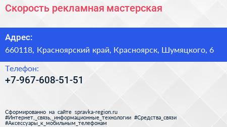 Скорость, рекламная мастерская по адресу 660118, Красноярский край, Красноярск, Шумяцкого, 6 в дальнейшем Организация, размещена в следующих категориях: