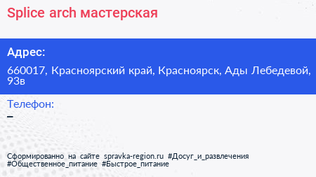 Splice arch, мастерская по адресу 660017, Красноярский край, Красноярск, Ады Лебедевой, 93в в дальнейшем Организация, размещена в следующих категориях: