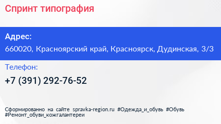 Спринт, типография по адресу 660020, Красноярский край, Красноярск, Дудинская, 3/3 в дальнейшем Организация, размещена в следующих категориях: