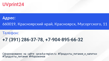 UVprint24 по адресу 660019, Красноярский край, Красноярск, Мусоргского, 11 в дальнейшем Организация, размещена в следующих категориях:
