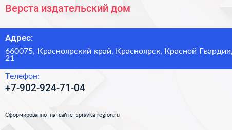 Верста, издательский дом по адресу 660075, Красноярский край, Красноярск, Красной Гвардии, 21 в дальнейшем Организация, размещена в следующих категориях: