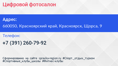 Цифровой фотосалон по адресу 660050, Красноярский край, Красноярск, Щорса, 9 в дальнейшем Организация, размещена в следующих категориях: