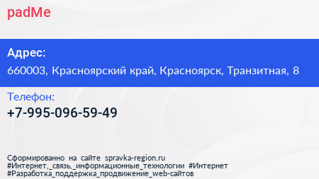 padMe по адресу 660003, Красноярский край, Красноярск, Транзитная, 8 в дальнейшем Организация, размещена в следующих категориях:
