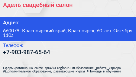 Адель, свадебный салон по адресу 660079, Красноярский край, Красноярск, 60 лет Октября, 110а в дальнейшем Организация, размещена в следующих категориях: