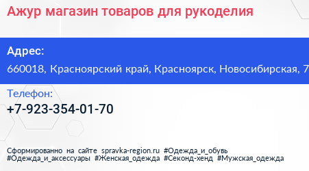 Ажур, магазин товаров для рукоделия по адресу 660018, Красноярский край, Красноярск, Новосибирская, 7 в дальнейшем Организация, размещена в следующих категориях: