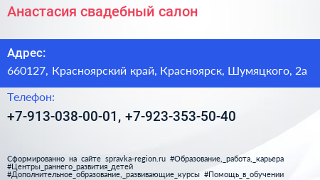 Анастасия, свадебный салон по адресу 660127, Красноярский край, Красноярск, Шумяцкого, 2а в дальнейшем Организация, размещена в следующих категориях: