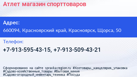 Атлет, магазин спорттоваров по адресу 660094, Красноярский край, Красноярск, Щорса, 50 в дальнейшем Организация, размещена в следующих категориях: