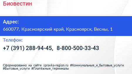 Биовестин по адресу 660077, Красноярский край, Красноярск, Весны, 1 в дальнейшем Организация, размещена в следующих категориях:
