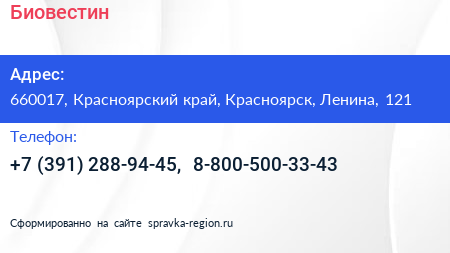 Биовестин по адресу 660017, Красноярский край, Красноярск, Ленина, 121 в дальнейшем Организация, размещена в следующих категориях: