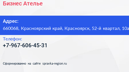 Бизнес-Ателье по адресу 660068, Красноярский край, Красноярск, 52-й квартал, 10а в дальнейшем Организация, размещена в следующих категориях: