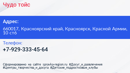 Чудо тойс по адресу 660017, Красноярский край, Красноярск, Красной Армии, 10 ст6 в дальнейшем Организация, размещена в следующих категориях: