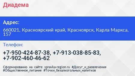 Диадема по адресу 660021, Красноярский край, Красноярск, Карла Маркса, 157 в дальнейшем Организация, размещена в следующих категориях:
