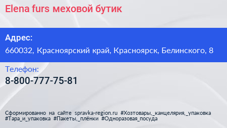 Elena furs, меховой бутик по адресу 660032, Красноярский край, Красноярск, Белинского, 8 в дальнейшем Организация, размещена в следующих категориях: