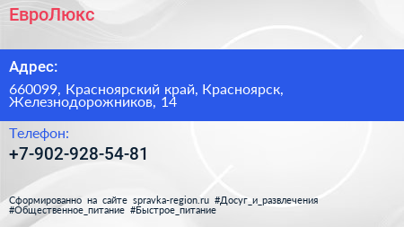ЕвроЛюкс по адресу 660099, Красноярский край, Красноярск, Железнодорожников, 14 в дальнейшем Организация, размещена в следующих категориях:
