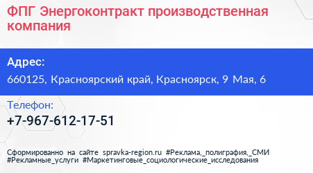 ФПГ Энергоконтракт, производственная компания по адресу 660125, Красноярский край, Красноярск, 9 Мая, 6 в дальнейшем Организация, размещена в следующих категориях: