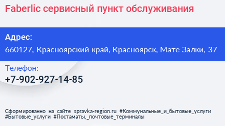 Faberlic, сервисный пункт обслуживания по адресу 660127, Красноярский край, Красноярск, Мате Залки, 37 в дальнейшем Организация, размещена в следующих категориях: