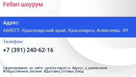 Fellari, шоурум по адресу 660077, Красноярский край, Красноярск, Алексеева, 49 в дальнейшем Организация, размещена в следующих категориях: