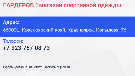 ГАРДЕРОБ №1, магазин спортивной одежды по адресу 660001, Красноярский край, Красноярск, Копылова, 76 в дальнейшем Организация, размещена в следующих категориях: