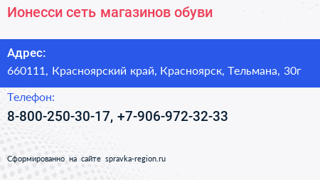 Ионесси, сеть магазинов обуви по адресу 660111, Красноярский край, Красноярск, Тельмана, 30г в дальнейшем Организация, размещена в следующих категориях:
