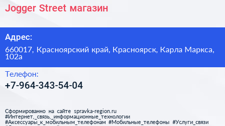 Jogger Street, магазин по адресу 660017, Красноярский край, Красноярск, Карла Маркса, 102а в дальнейшем Организация, размещена в следующих категориях: