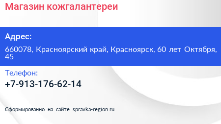 Магазин кожгалантереи по адресу 660078, Красноярский край, Красноярск, 60 лет Октября, 45 в дальнейшем Организация, размещена в следующих категориях: