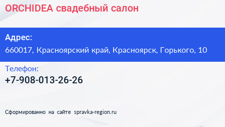 ORCHIDEA, свадебный салон по адресу 660017, Красноярский край, Красноярск, Горького, 10 в дальнейшем Организация, размещена в следующих категориях: