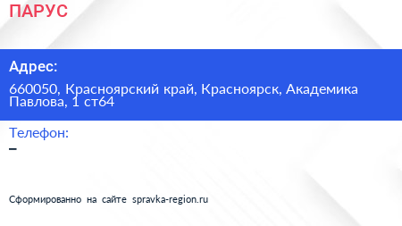 ПАРУС по адресу 660050, Красноярский край, Красноярск, Академика Павлова, 1 ст64 в дальнейшем Организация, размещена в следующих категориях: