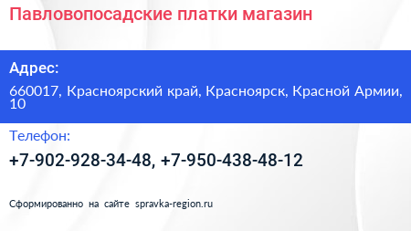 Павловопосадские платки, магазин по адресу 660017, Красноярский край, Красноярск, Красной Армии, 10 в дальнейшем Организация, размещена в следующих категориях: