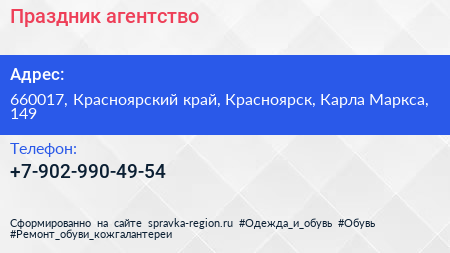 Праздник, агентство по адресу 660017, Красноярский край, Красноярск, Карла Маркса, 149 в дальнейшем Организация, размещена в следующих категориях: