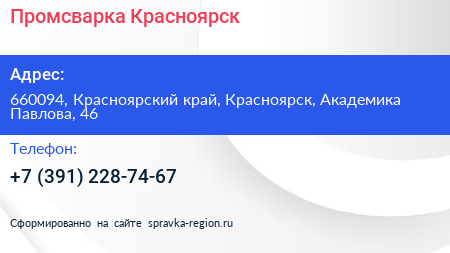 Промсварка-Красноярск по адресу 660094, Красноярский край, Красноярск, Академика Павлова, 46 в дальнейшем Организация, размещена в следующих категориях: