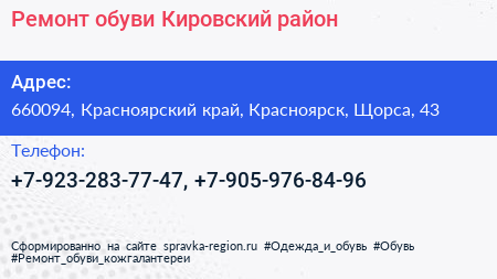 Ремонт обуви, Кировский район по адресу 660094, Красноярский край, Красноярск, Щорса, 43 в дальнейшем Организация, размещена в следующих категориях: