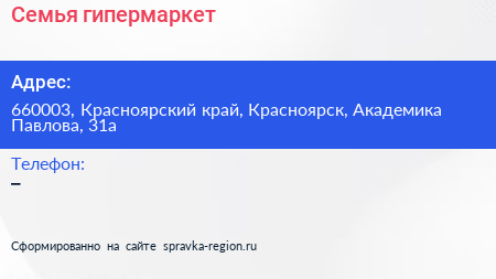 Семья, гипермаркет по адресу 660003, Красноярский край, Красноярск, Академика Павлова, 31а в дальнейшем Организация, размещена в следующих категориях: