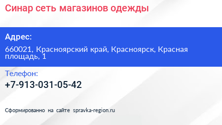 Синар, сеть магазинов одежды по адресу 660021, Красноярский край, Красноярск, Красная площадь, 1 в дальнейшем Организация, размещена в следующих категориях: