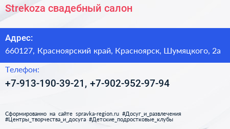 Strekoza, свадебный салон по адресу 660127, Красноярский край, Красноярск, Шумяцкого, 2а в дальнейшем Организация, размещена в следующих категориях: