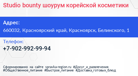 Studio bounty, шоурум корейской косметики по адресу 660032, Красноярский край, Красноярск, Белинского, 1 в дальнейшем Организация, размещена в следующих категориях: