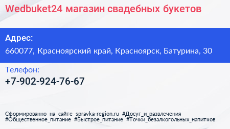 Wedbuket24, магазин свадебных букетов по адресу 660077, Красноярский край, Красноярск, Батурина, 30 в дальнейшем Организация, размещена в следующих категориях: