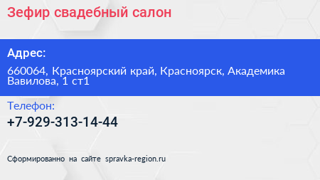 Зефир, свадебный салон по адресу 660064, Красноярский край, Красноярск, Академика Вавилова, 1 ст1 в дальнейшем Организация, размещена в следующих категориях: