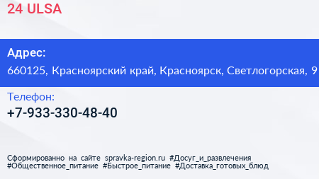 24 ULSA по адресу 660125, Красноярский край, Красноярск, Светлогорская, 9 в дальнейшем Организация, размещена в следующих категориях: