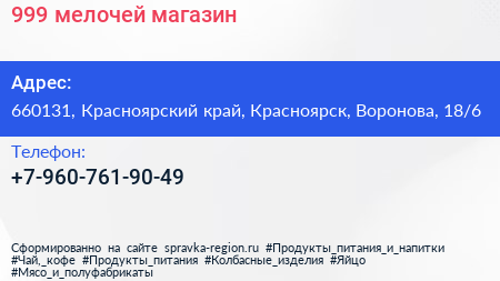 999 мелочей, магазин по адресу 660131, Красноярский край, Красноярск, Воронова, 18/6 в дальнейшем Организация, размещена в следующих категориях: