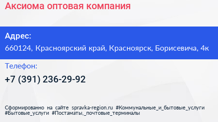 Аксиома, оптовая компания по адресу 660124, Красноярский край, Красноярск, Борисевича, 4к в дальнейшем Организация, размещена в следующих категориях: