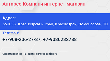 Антарес Компани, интернет-магазин по адресу 660058, Красноярский край, Красноярск, Ломоносова, 70 в дальнейшем Организация, размещена в следующих категориях: