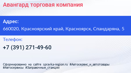 Авангард, торговая компания по адресу 660020, Красноярский край, Красноярск, Спандаряна, 5 в дальнейшем Организация, размещена в следующих категориях:
