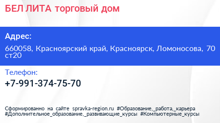 БЕЛ-ЛИТА, торговый дом по адресу 660058, Красноярский край, Красноярск, Ломоносова, 70 ст20 в дальнейшем Организация, размещена в следующих категориях: