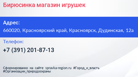 Бирюсинка, магазин игрушек по адресу 660020, Красноярский край, Красноярск, Дудинская, 12а в дальнейшем Организация, размещена в следующих категориях: