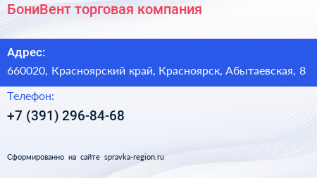 БониВент, торговая компания по адресу 660020, Красноярский край, Красноярск, Абытаевская, 8 в дальнейшем Организация, размещена в следующих категориях: